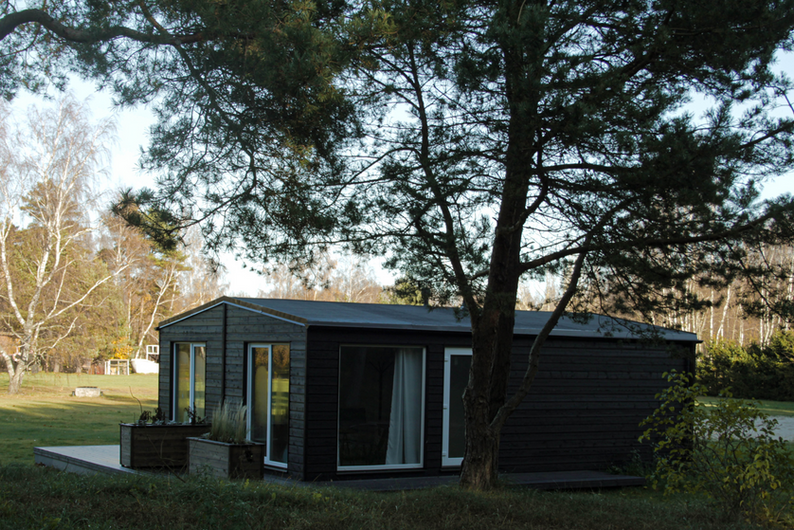 Ett modulhus för en barnfamilj omgivet av flerbostadshus och privata hus.
